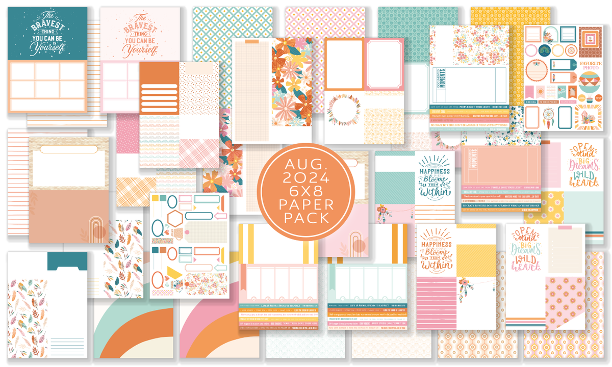 Shop our August 2024 Pocket Life Cards and Ephemera Shapes set, featuring a HKC Exclusive Good Vibe 6x8 DOUBLE SIDED Heavy Weight Cardstock Paper Pack with 18 sheets. Includes Cut Apart Journaling Cards, Tags, Tabs, Labels, and coordinating patterned papers. Perfect for adding a creative touch to your scrapbooking projects.