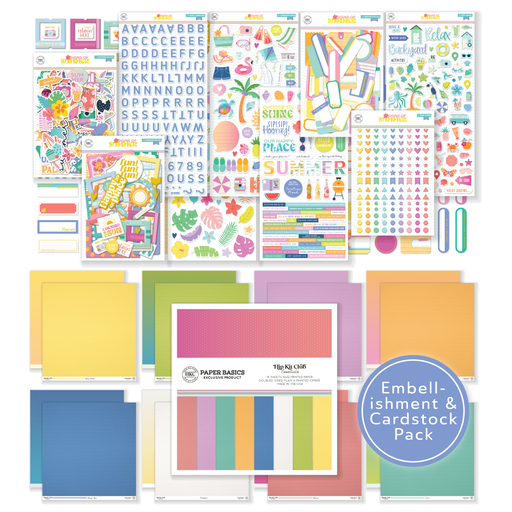 Our August 2025 Hip Kit Club Main Scrapbook Kit Bundle with Cardstock is packed with exclusive "Signs of Summer" embellishments, including ephemera, chipboard frames, epoxy stickers, foil-accented tags, puffy shapes, alphabet stickers, and multiple cardstock sticker sheets. You'll also find beautiful florals, titles, mini phrases, icons, and accents to bring your summer memories to life. Plus, the full cardstock kit features premium sheets perfect for crafting vibrant, personalized scrapbook pages. This bundle offers everything you need to create stunning summer-themed projects with ease and style.