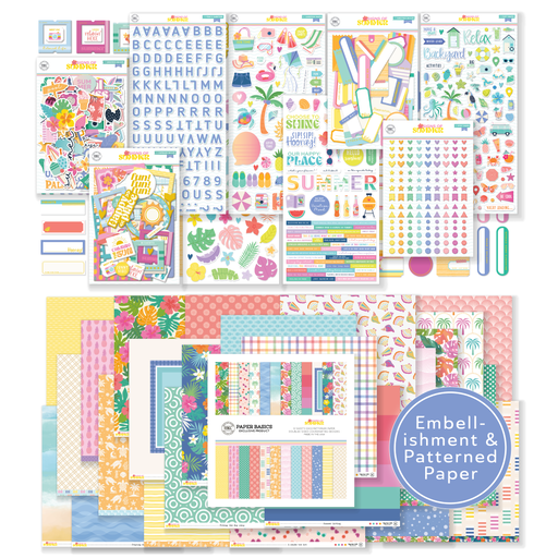 Capture your summer memories with the August 2025 Hip Kit Club Main Scrapbook Kit Bundle. This all-in-one set includes a full embellishment kit featuring exclusive "Signs of Summer" ephemera, chipboard frames, epoxy stickers, foil-accented tags, puffy shapes, alphabet stickers, and more. You'll also receive a complete patterned paper kit designed to complement your projects perfectly. With florals, titles, mini phrases, icons, and accents included, this kit offers everything you need to create vibrant, personalized scrapbook pages that celebrate the season.