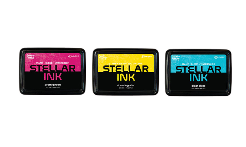 The July 2025 Hip Kit Club Color Scrapbook Kit includes three Simon Hurley Creates Stellar Ink Pads in Prom Queen, Shooting Star, and Clear Skies. These vibrant inks are perfect for adding colorful, creative touches to your scrapbook projects, making your memories stand out with ease and fun.