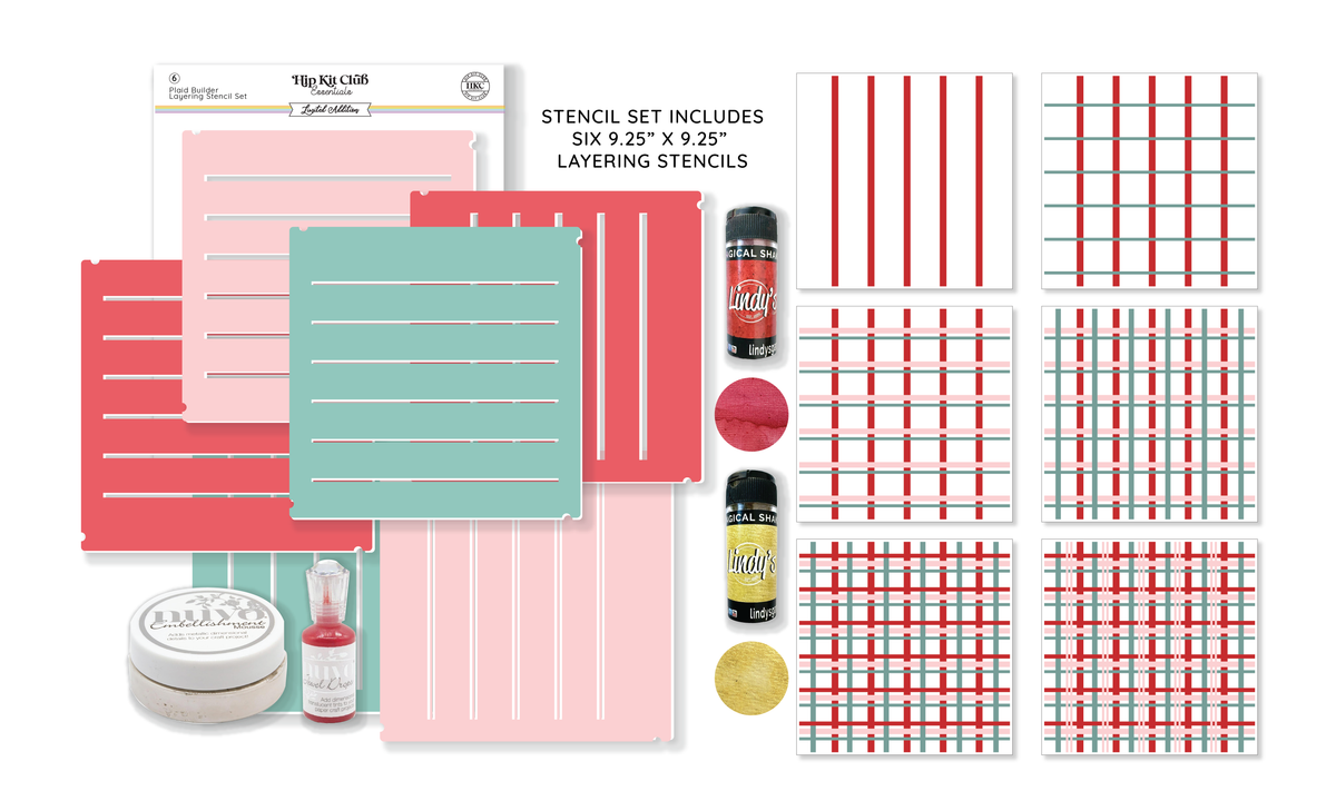 - 1 pkg. - HKC Exclusive - Mistletoe Memories - 9"x 9" Layering Stencil Set (includes 6 stencils that can be combined in various ways to create unique stripe & plaid designs)
